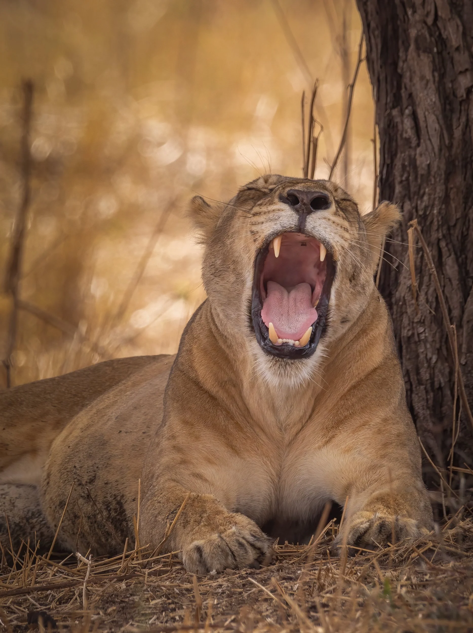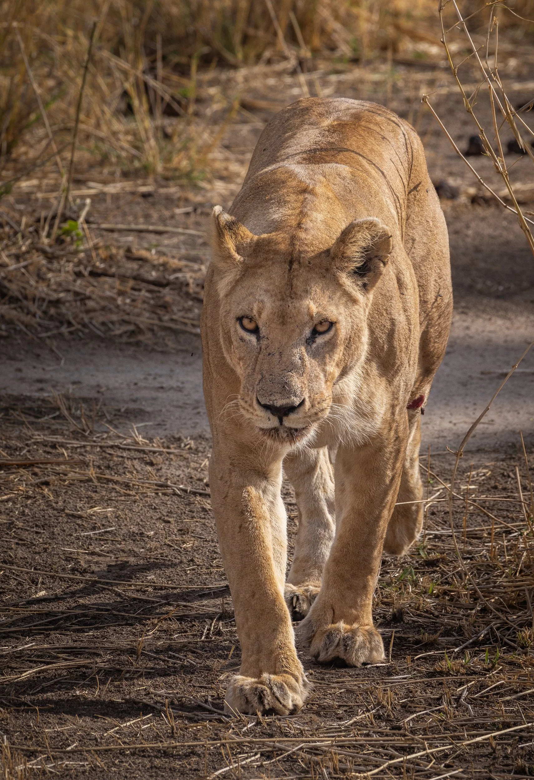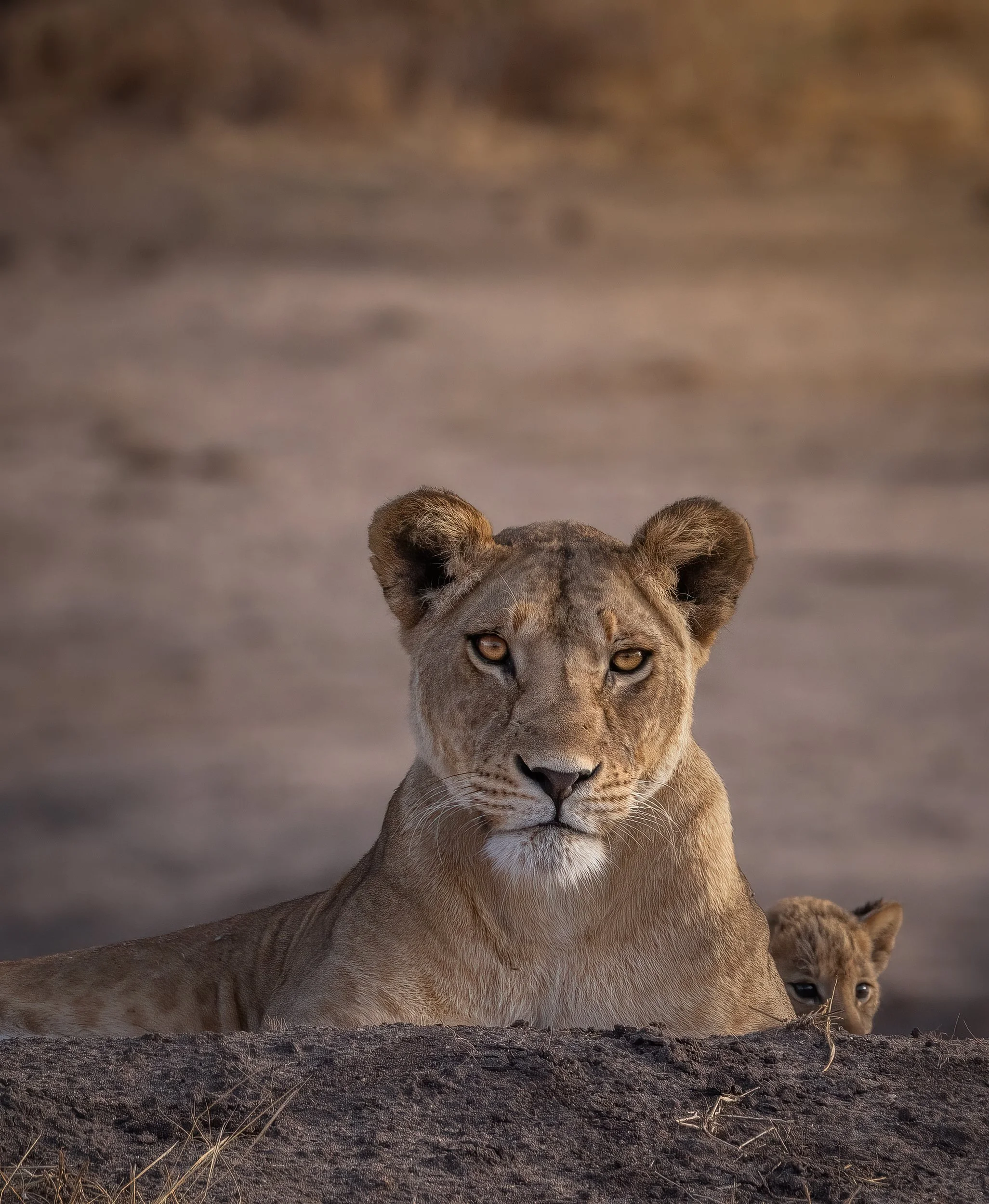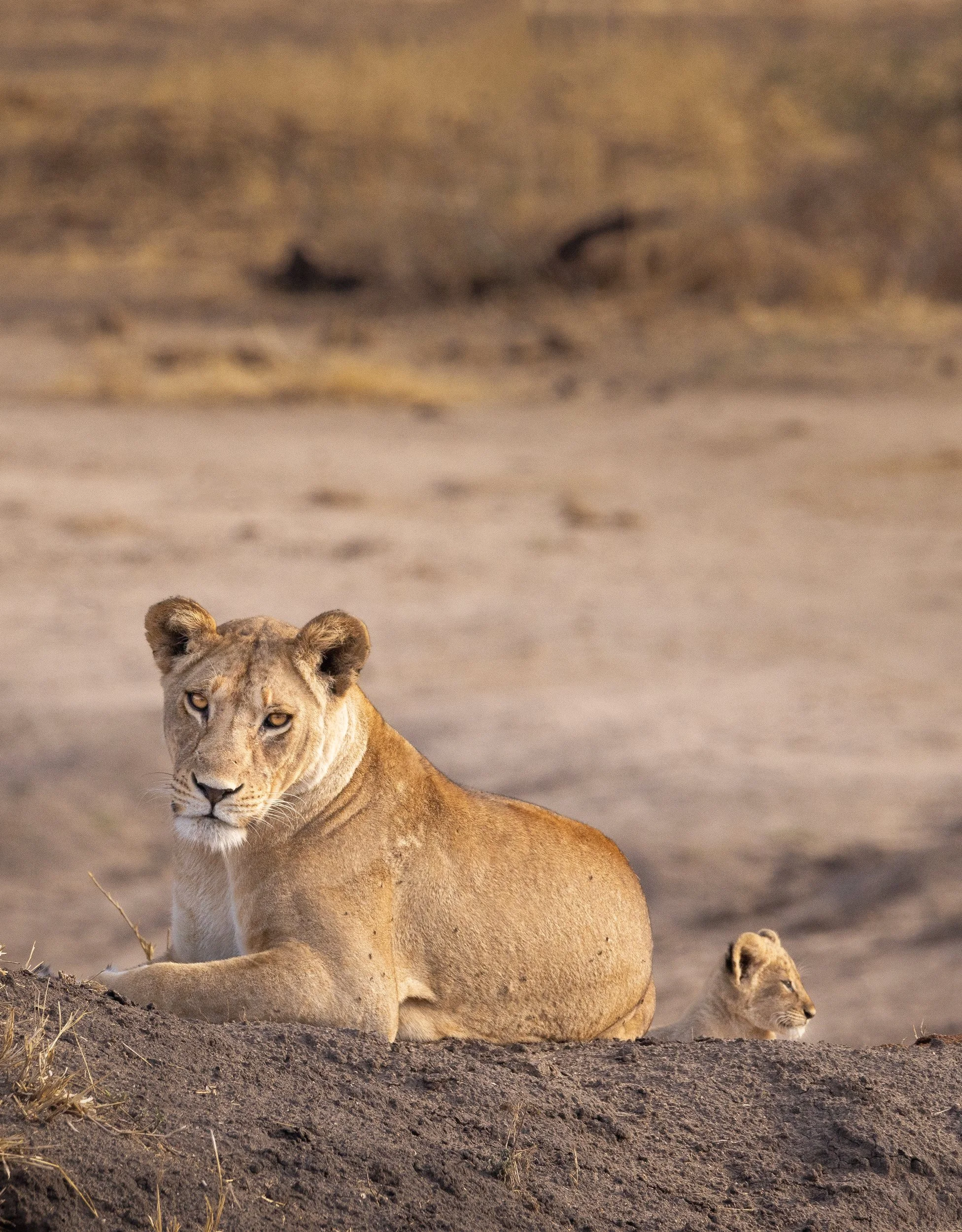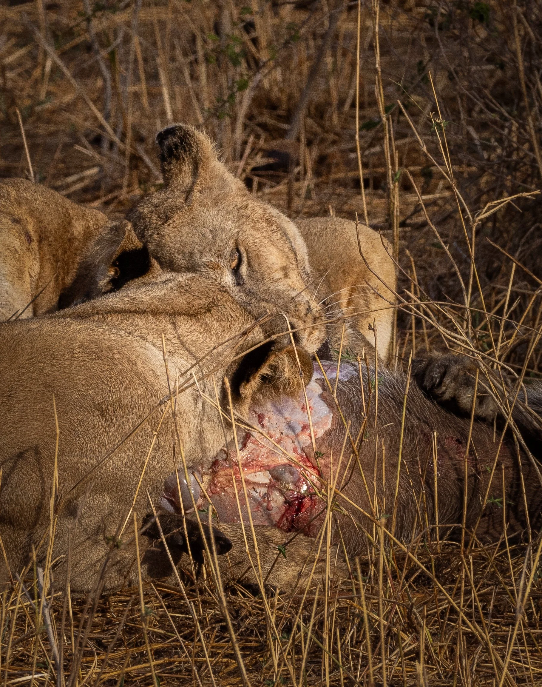 I cannot begin to describe what it is like to see a huge lion wander by the open-sided vehicle - close enough to touch, or a lioness preside over her recent kill - panting with steam rising off her back, hot from the chase, or the sweet play of a mother and her young cub in the early morning light.